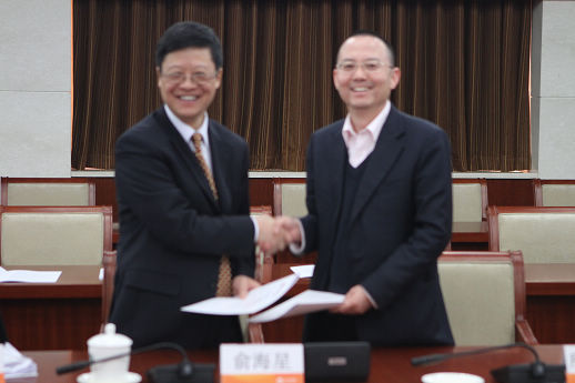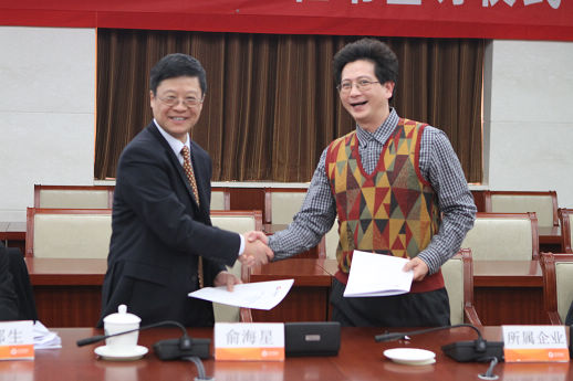 俞海星总部门经理与造纸工业院校长曹春昱签属重任书